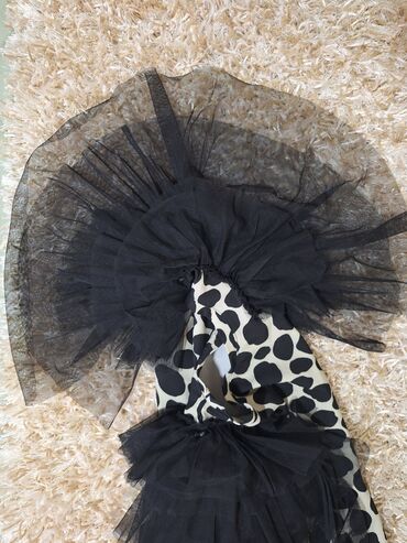 - Rukavi: dramatični, višeslojni volan-rukavi od crnog tila