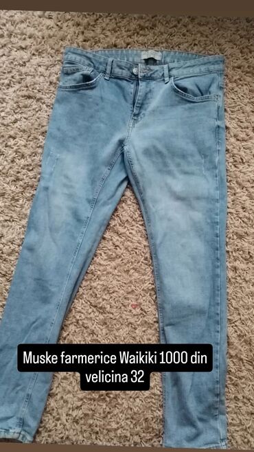 - LC Waikiki, svetloplavi teksas, klasičan kroj sa pet džepova, dugme i rajsferšlus, petlje za kaiš. Veličina 32. Cena: 1000 din.
