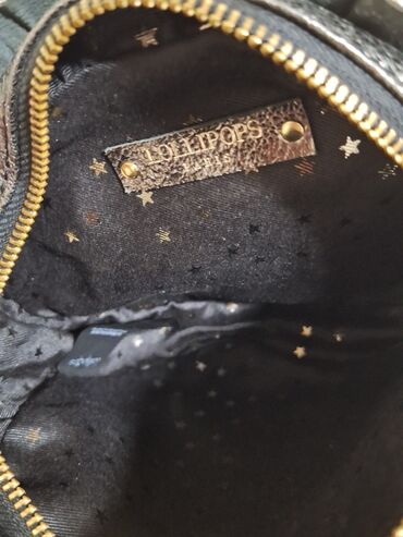 Crna ženska torba/ranac od kože, sa metalnim detaljima u zlatnoj boji. Na prednjoj strani nalazi se ukrasna pločica sa natpisom „Suang“, kao i funkcionalni spoljni rajsferšlus sa priveskom u obliku...