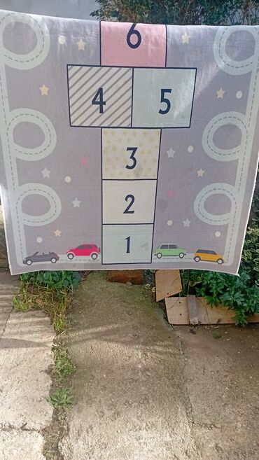- Dečije ćebe/plišani prekrivač sa igrom “školice” (brojevi 1–6), sivo sa šarama zvezdica i autića.