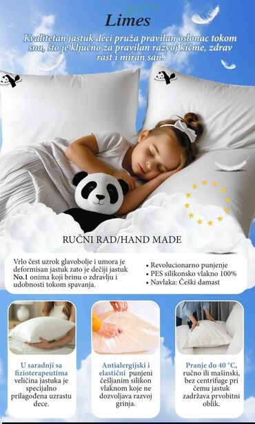 Limes dečiji jastuk je ručni rad, antialergijski, razvijen u saradnji sa fizioterapeutima i prilagođen uzrastu dece.