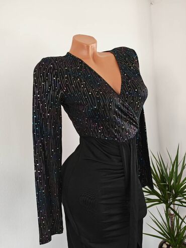 Zara mini haljina dugih rukava maslinasto zelenim i crnim tonovima, ukrašena šljokicama, idealna za večernje izlaske. Haljina ima dubok V-izrez i mrežaste detalje na gornjem delu, dok su ramena nag...