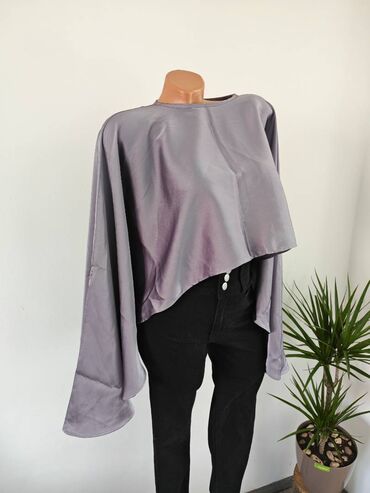 Ženska bluzica/tunika sa dugim rukavima i V izrezom. Siva melanž tkanina sa sitnim sjajem, ukrašena diskretnim cvetnim motivima na prednjem delu. Ušiven “lažni” sloj ispod V izreza sa belim kragnom...