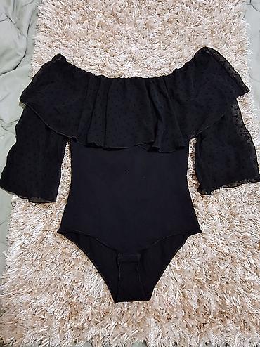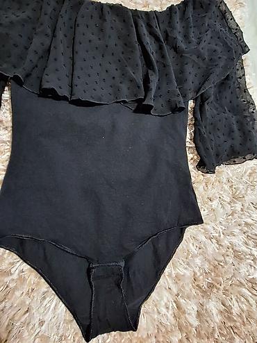 Tezenis bodi – crni, elegantan model sa spuštenim ramenima i volanom