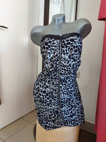 1) Strapless mini haljina sa animal printom (crno‑beli žirafa/leopard dezen)