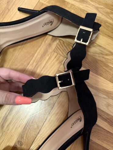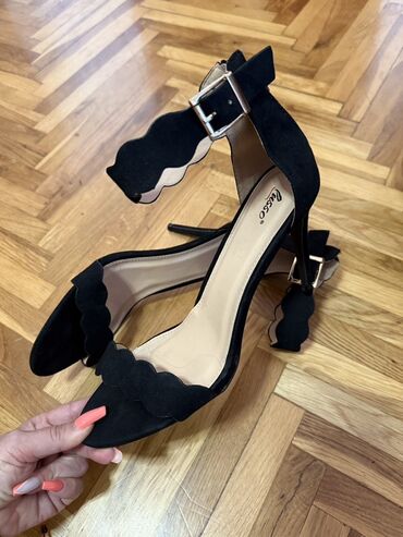 Ženske sandale na štiklu u crnoj boji, broj 41,idealne za svečane prilike ili elegantne svakodnevne kombinacije. Odlikuje ih dekorativni talasasti detalj na kaiševima preko prstiju i oko zgloba. Sandale imaju tanak kaiš oko zgloba sa podesivom zlatnom kopčom, što omogućava sigurno i udobno nošenje. Tanka štikla pruža elegantan izgled i izdužuje figuru. Unutrašnjost sandale je bež boje, što stvara kontrast sa crnom spoljašnjošću. Praktičan izbor za večernje izlaske, proslave ili poslovne događaje.