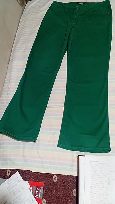 - Zelene pantalone: pamučni keper/čino stil, pet džepova, ravna nogavica, standardno kopčanje (cibzar + dugme), petlje za kaiš. Intenzivna zelena boja.