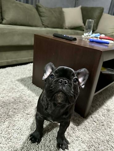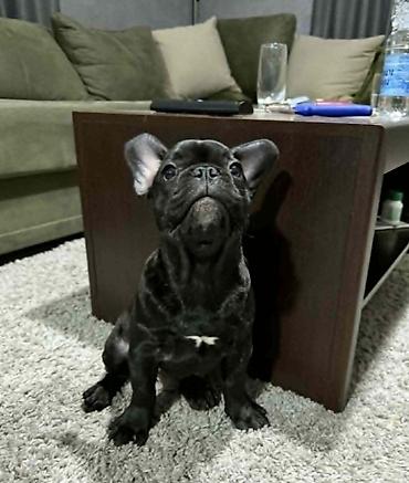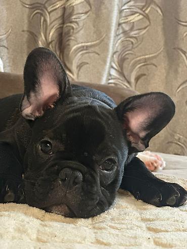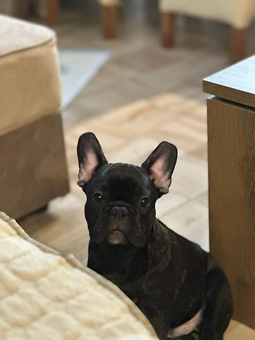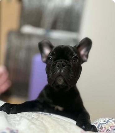 Francuski buldog, crne boje sa malom belom tačkicom na grudima.Lepe
