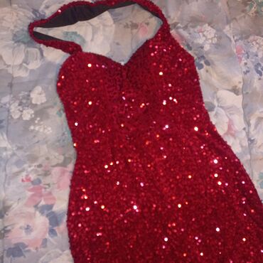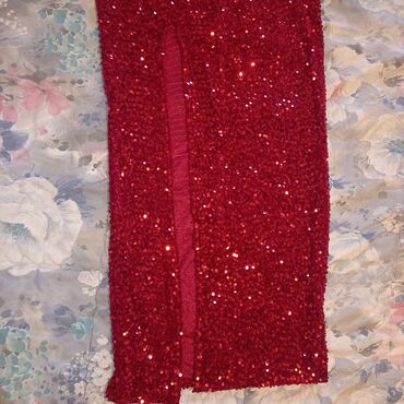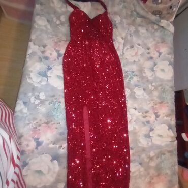 Duga crvena svečana haljina sa šljokicama.
