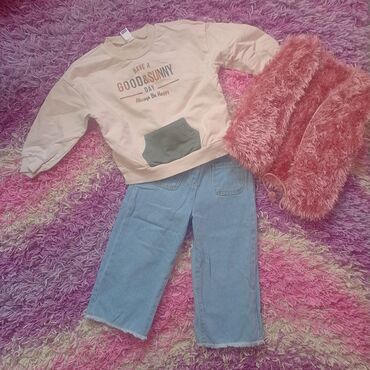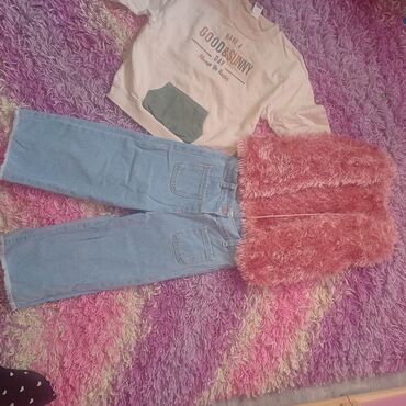 Dečiji komplet (za devojčice) – 3 dela: - Farmerke od svetlog teksasa, model sa poderotinama i resicama, elastičan struk za udobnost. - Džins prsluk u istoj nijansi, sa metalnim dugmićima i dekora...