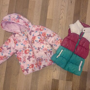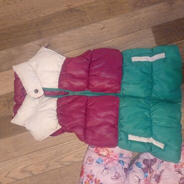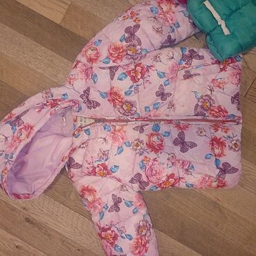- Jakna sa kapuljačom, brenda The Arttu Jacket (etiketa na slici). Veličina 110 (za visinu oko 104–110 cm). Svetloružičasta osnova sa cvetnim i leptir dezenom. Topla, prošivena, sa rajsferšlus zatvaranjem napred i dva bočna džepa. Unutrašnjost postavljena mekanim flisom u svetloružičastoj boji.