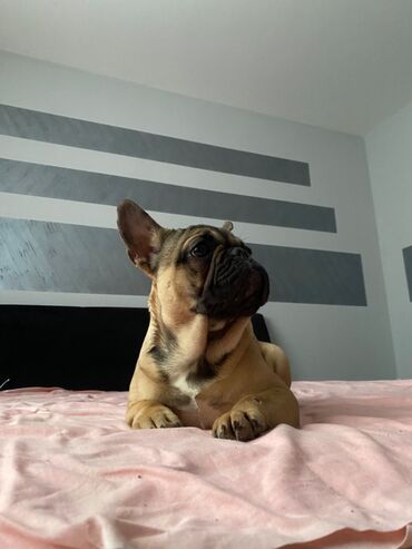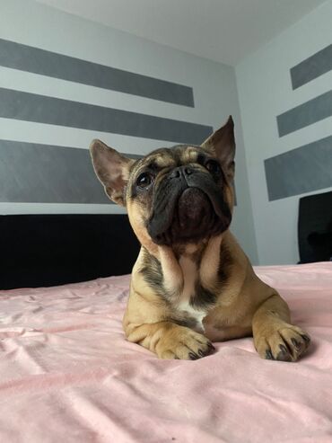 Francuski buldog – mužjak - Rasa: francuski buldog - Pol: mužjak - Dlaka: kratka, tigrasta/fawn nijansa sa tamnijom maskom - Uši: uspravne, tipične “šišmiš” uši - Njuška: kratka, široka, izražene ...