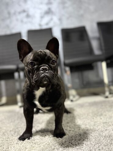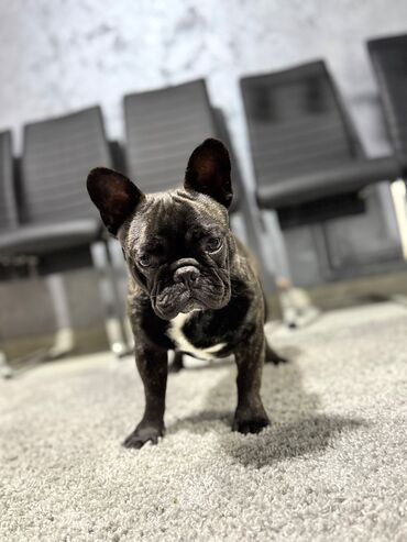 Francuski buldog – crni tigrasti (brindle) sa belom grudnom oznakom.