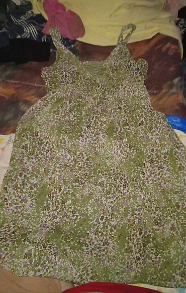- Zelena letnja haljina na bretelle, lagan materijal, sitan cvetni print u belim, ljubičastim i braon tonovima. Široka, lepršava forma, V-izrez, pogodna za tople dane.