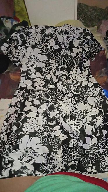 - Crno‑bela haljina sa kratkim rukavima i izraženim cvetnim dezenom po celoj površini. Blago strukirana silueta, srednja dužina.