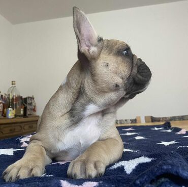 Francuski buldog, štene fawn boje sa crnom maskom.