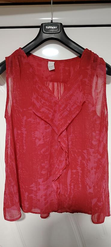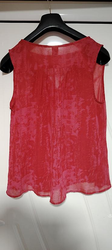 Ženska bluzica bez kragne, u boji terakota/korala. - Materijal: lagana, prozračna tkanina sa diskretnom teksturom u vertikalnim prugama (ušiveni dekorativni šavovi). - Kroj: kratki rukavi; V-izre...