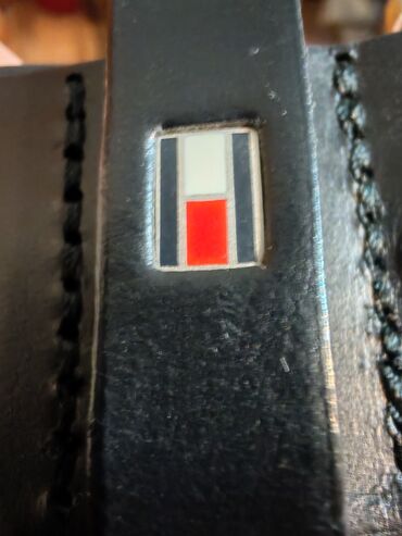 - Detalj: ukrasna emajlirana pločica sa geometrijskim motivom u sivoj, tamnosivoj i crvenoj boji na petlji kaiša