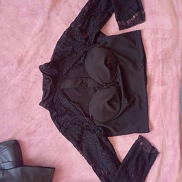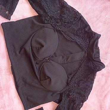 - Gornji deo: crni crop top sa polukorset krojem i izgrađenim korpama. Dugi rukavi od čipke, čipkani detalji preko ramena i dekoltea. Visoka kragna, materijal elastičan, prijanja uz telo. Zatvaranje pozadi skrivenim rajsferšlusom.