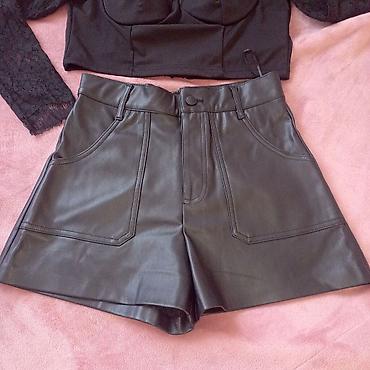 - Donji deo: crni visoki struk, šorts od veštačke kože (eko-koža). Široke nogavice, izraženi krojački štepovi, duboki ukrasni/delimično funkcionalni džepovi napred, petlje za kaiš. Kopčanje napred na dugme i rajsferšlus.