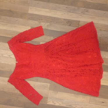 - Materijal: spolja dekorativna čipka sa floralnim motivima, ispod kompletna postava u istoj crvenoj nijansi