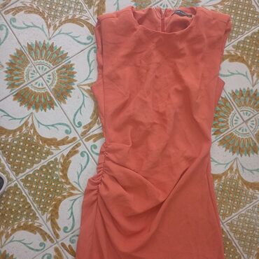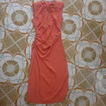 Jednostavna ženska midi haljina bez rukava u koralnoj boji. Haljina ima okrugli izrez i diskretan rajsferšlus na leđima za lako oblačenje. Bočni nabori sa desne strane dodaju teksturu i drape, stvarajući elegantnu siluetu. Pogodna je za razne prilike, od dnevnih do večernjih.