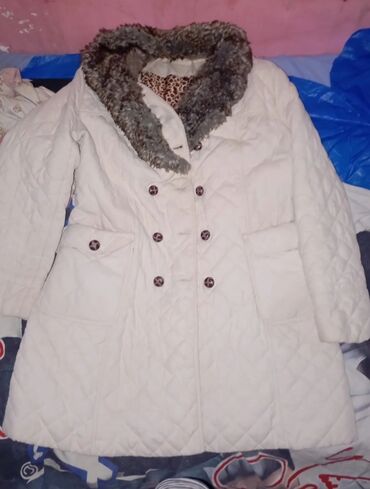 - Bela prošivena ženska jakna/kaput do iznad kolena, duplo kopčanje (dugmad), veliki krzneni okovratnik, dva velika prednja džepa, topla postava sa animal printom.