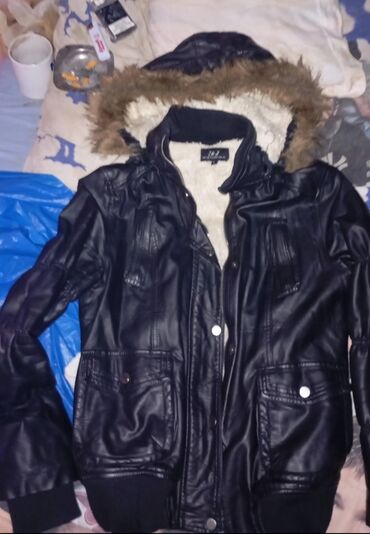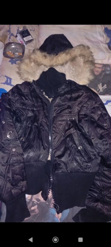 - Crna kratka zimska jakna (bomber stil), prošivena, sa kapuljačom i krznenim obodom, rajsferšlus, više džepova, metalni prstenovi/detalji, rebrani ranfle na rukavima i struku.