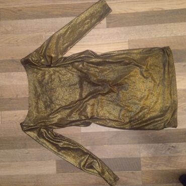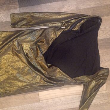 MikrofiberZlatna mini haljina sa dugim rukavima i rastegljivim, sjajnim metalik efektom. Kroj je pripijen uz telo, sa širim okruglim izrezom. Unutrašnjost gornjeg dela ima crni postavljeni sloj za udobnije nošenje i bolju pokrivenost. Tkanina je elastična, mekana i blago svetlucava pod svetlom, idealna za večernje izlaske i svečanosti. Dužina iznad kolena, ravnog poruba. Moderne linije naglašavaju siluetu, a materijal se lepo prilagođava figuri. Boja: zlatna metalik sa suptilnim sjajem.