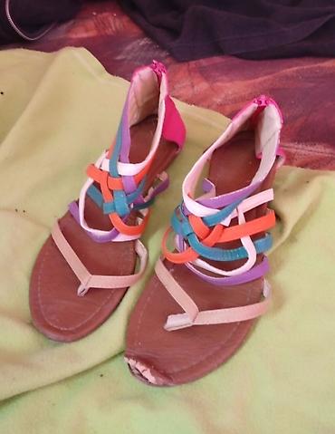 - Par 1: Ravne sandale sa prstima (T-remen), braon đon i bež kaiševi, gornji deo isprepletan šarenim kožnim/eko-kožnim trakama (ljubičasta, tirkizna, narandžasta, bela, roze). Zatvaranje na rajsferšlus pozadi pete. Fleksibilan đon, udoban oblik stopala.