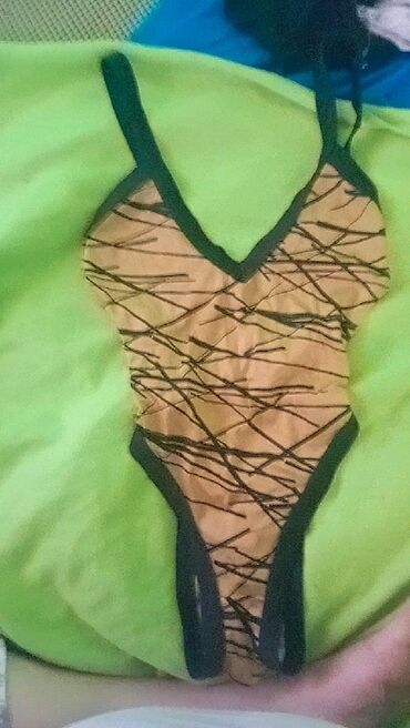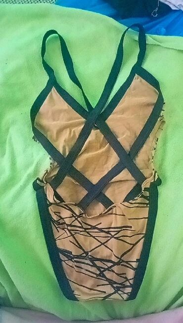 NovoJednodelni kupaći kostim u kombinaciji žute i crne boje, dizajniran sa apstraktnim crnim linijama na žutoj pozadini. Kupaći kostim ima V-izrez napred i ukrštene trake na leđima, što pruža moderan i atraktivan izgled. Materijal je rastegljiv i prijatan za nošenje, idealan za plažu ili bazen. Ovaj model je pogodan za sve koji traže jedinstven i udoban kupaći kostim sa zanimljivim detaljima. Ima mali geler, rupica sa strane, ali skoro da se ne vidi