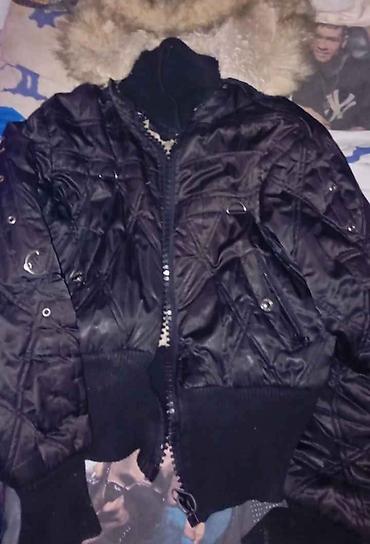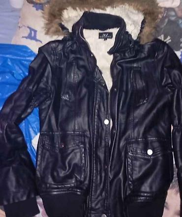 - Crna kratka jakna od eko-kože sa kapuljačom obrubljenom krznom i toplom belom postavom od flisa/veštačkog krzna. Više spoljašnjih džepova sa dugmadima i rajsferšlusom, elastične ranfle na rukavima i struku.