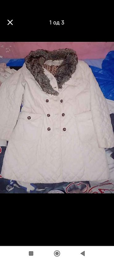 - Bela prošivena ženska jakna do sredine butine, duplo kopčanje (dugmad), širok rever obložen sivim veštačkim krznom. Dva velika prednja džepa sa dugmetom. Topla, sa dezeniranom postavom.