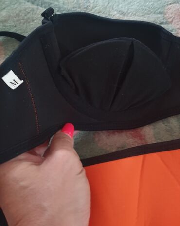 DvodelniKupaći kostim bikini , neopren, kao triangle model gornji deo i ima ojačanje za grudi, odlicno stoji. Neon narandzasta boja oivičena crnom.. Ima umetke u brusu , slikano je. Donji deo isto narandžast, oivicen crnom. Piše M velicina i odgovara broju , mada moze i S. Od neprena je. Treba se oprati i ispeglati, izguzvao se kako je bio savijen.