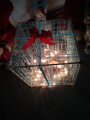 - Konstrukcija: metalna žičana kocka obložena špagom/kanapom, formirana kao dar sa ukrasnom trakom i mašnom na vrhu.