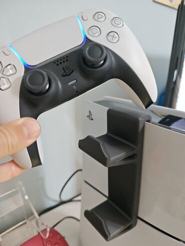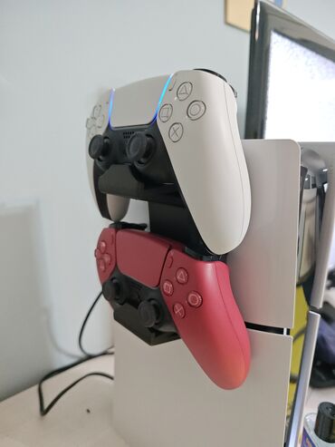 Idealno rešenje za organizaciju i uvek spremne kontrolere, sa jasnim signaliziranjem statusa i kompaktnim rasporedom uz konzolu. Kontroleri na fotografiji: jedan bele i jedan crvene boje (DualSense).