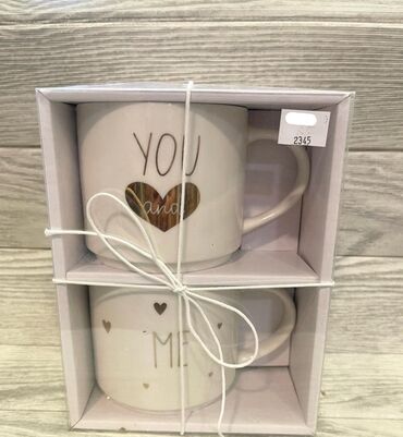 - Set 2: dve svetle keramičke šolje sa natpisima “YOU and” (sa zlatnim srcem) i “ME”, ukrašene sitnim zlatnim srcima.