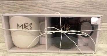 - Set 1: dve šolje sa natpisima “MRS” (svetla/bež šolja) i “MR” (tamna/crna šolja) u zlatnom slovima.