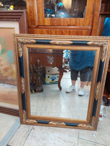 Ukrasno ogledalo sa postoljem, bogato ukrašeno detaljnim rezbarijama u zlatnoj boji. Postolje je prekriveno crnom pločom, verovatno od mermera ili drugog sličnog kamena. Ornamentika uključuje motiv...