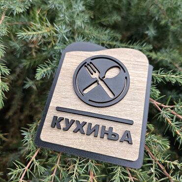 - Dizajn: kružni piktogram sa ukrštenom kašikom i viljuškom, 3D izrez u kontrastu; ispod natpis „КУХИЊА” u ćiriličnom ili latiničnom pismu sa horizontalnom linijom.