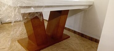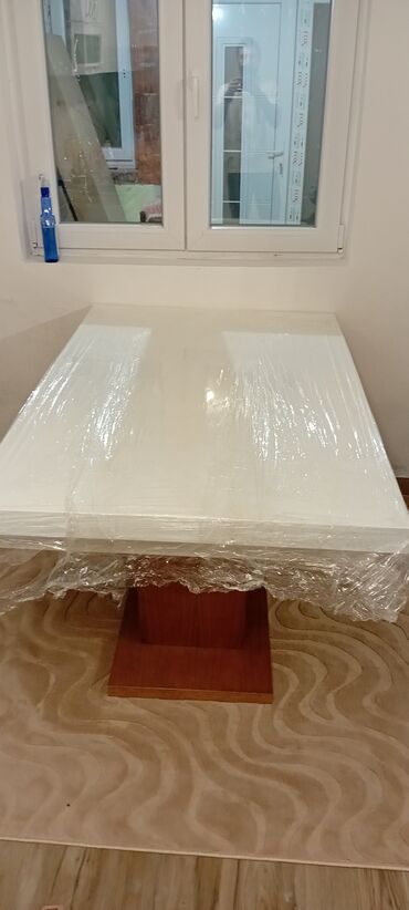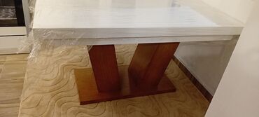 - Dimenzije ploče (procena po fotografijama): približno širina 90 cm, dužina 140 cm; visina standarda – kombinacija bele ploče i drvenog postolja lako se uklapa u moderne kuhinje i trpezarije.