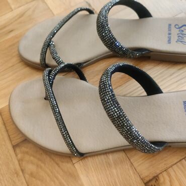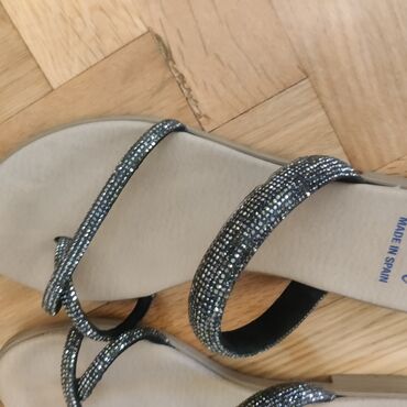 RavneŽenske ravne sandale sa tankim kaiševima ukrašenim cirkonima. Kaiševi su elegantno isprepleteni preko risa i oko palca, nudeći moderan izgled i stabilnost. Sandale su idealne za letnje dane i večernje izlaske, pružajući udobnost i stil. Izrađene su u Španiji , kupljene u Nemačkoj , jako mi je žao da ih prodam nosila sam par puta ali na žalost na njima piše broj 40 ali odgovaraju broju 39