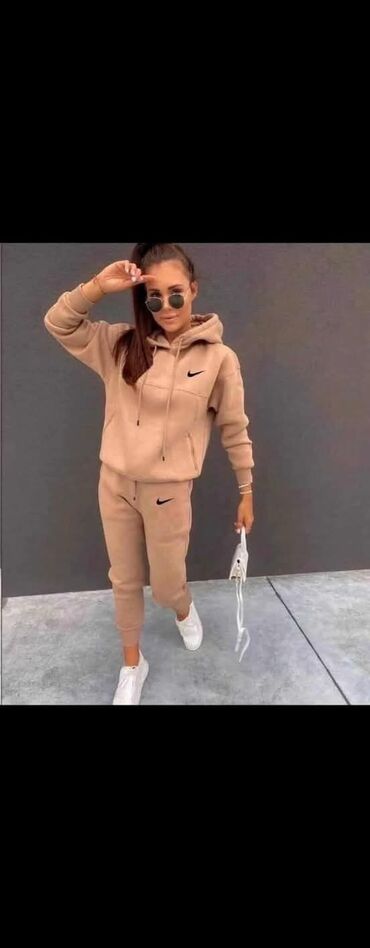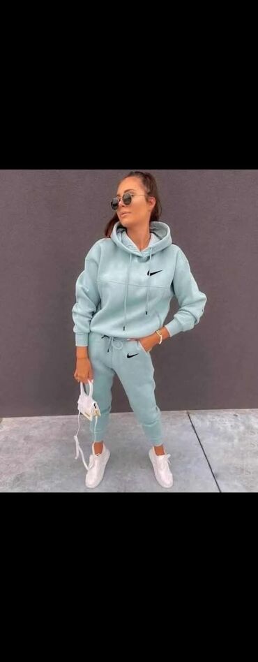 Dvoslojni ženski trenerka-komplet (duks + donji deo) sa kapuljačom i kengur džepom. Materijal deluje kao mekana, topla pamučna/futer tkanina sa elastičnim ranflama na rukavima i nogavicama. Gornji deo: klasična hoodie forma sa učkurom na kapuljači i malim logom na levoj strani grudi. Donji deo: jogger kroj sa lastišem i učkurom u struku, bočnim džepovima i diskretnim logom na butini.