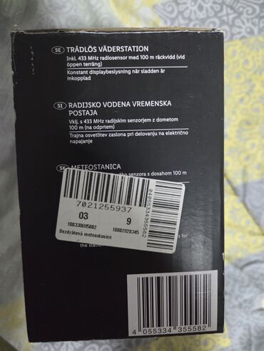 - Prikaz: unutrašnja i spoljašnja temperatura (°C), vlažnost (%), prognozni piktogrami, barometarski prikaz/trend, datum i dan u nedelji, digitalni sat