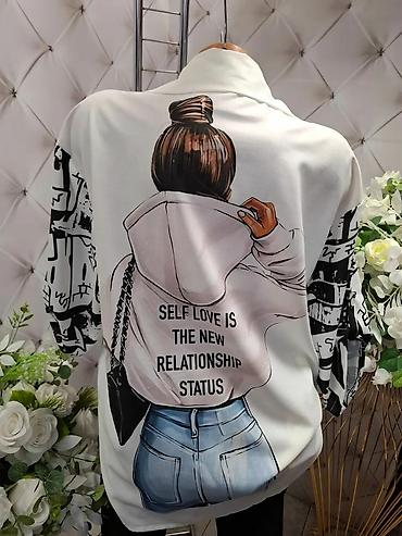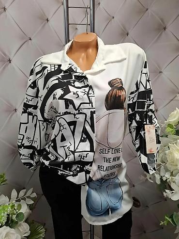Damska košulja sa printom – model sa kragnom i dugmićima, dugi rukavi sa lagano pufnastim efektom. Asimetrični dizajn: jedna polovina sa crno-belim grafiti printom, druga sa ilustracijom devojke u dukserici i farmerkama. Na prednjem i zadnjem delu nalazi se natpis “SELF LOVE IS THE NEW RELATIONSHIP STATUS”. Materijal je lagan, prijatan na dodir, sa lepim padom i blagim sjajem. Krojena komotnije, pogodna za svakodnevne i casual kombinacije uz farmerke, suknje ili pantalone. Bela osnova sa kontrastnim crnim i pastelnim tonovima printa.