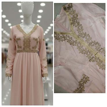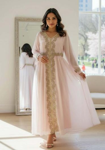 Elegantna duga haljina u nežno ružičastoj boji sa raskošnim zlatnim vezom.