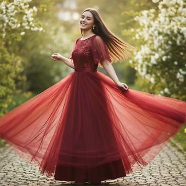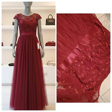 Elegantna večernja haljina u tamnoljubičastoj boji. - Gornji deo: duboki V izrez, prekriven sitnim šljokicama koje diskretno sijaju. - Struk: drapirani pojas sa naborima koji vizuelno sužavaju stru...
