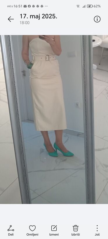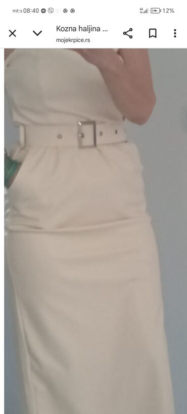 - Haljina: midi dužina, uski kroj koji prati liniju tela, bez bretela. Svetla bež/šampanj nijansa. U kompletu je širok kožni kaiš sa pravougaonim metalnim kopčanjem i rupicama za podešavanje. Ušivene bočne džepove. Glatka kožna tekstura, čistih linija – idealna za svečane prilike i večernje izlaske.