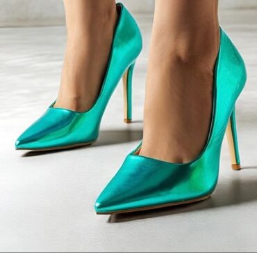 - Cipele: klasične salonke u upadljivoj metalik tirkiznoj boji. Špicasti vrh, visoka i tanka potpetica (stiletto), glatka završna obrada sa blago reflektujućim sjajem. Diskretan đon u prirodnoj boji.