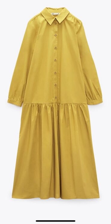 Ova Zara žuta haljina, veličine 2XL (EU 44), predstavlja ležeran i udoban komad. Izrađena je od tkanine koja podseća na pamuk, što je čini prijatnom za nošenje. Haljina ima klasičnu kragnu i dugačke rukave sa manžetnama. Prednji deo haljine je opremljen kopčanjem na dugmad, dok je struk definisan naboranim detaljem koji dodaje volumen donjem delu. Dužina haljine je midi, što je čini pogodnom za različite prilike.